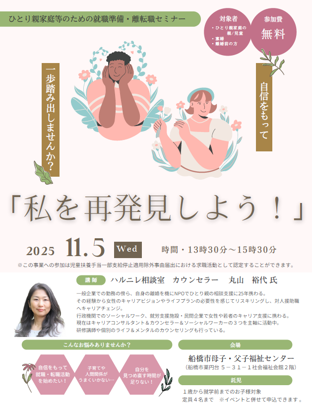 2025-10-19 / 最終更新日時 : 2025-10-19 丸山裕代 お知らせ 船橋市でひとり親向けの就労セミナーを行います 今回のタイトルは「私を再発見しよう!」となっており、いろいろな不安を抱える就・転職で、ひとり親ならではの“あるある”を踏まえてワークをしながら自己理解をする内容となっています。船橋市にお住まいの方はぜひお越しください。